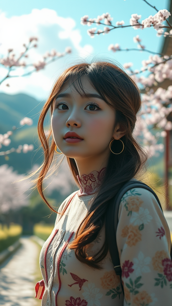 A captivating close-up portrait of a girl immersed in music as she strolls through a picturesque Japanese landscape during summer. The scene is centered, showcasing intricate details that highlight her breathtaking beauty. Inspired by the cinematic style of Lois van Baarle, it features a serene atmosphere with clear skies and lush surroundings. The focus is on expressing the emotive connection between the girl and the music, with a touch of artistic creativity to enhance the overall composition.