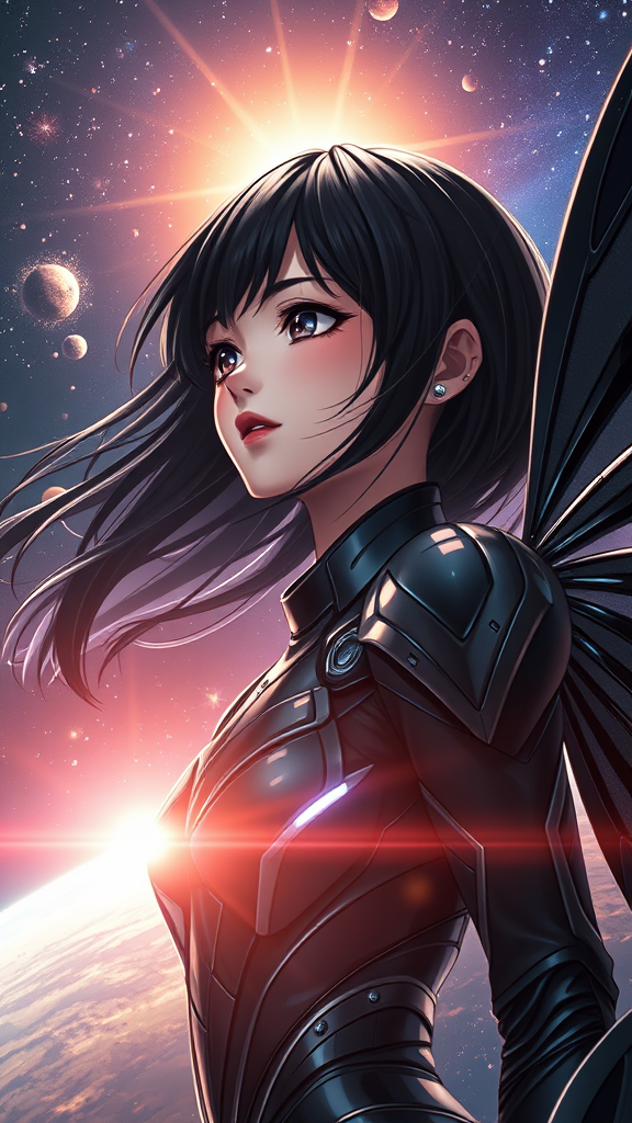 A captivating close-up portrait of a stunning girl in a sleek Sci-fi exo-suit, her face exuding a dreamy elegance. She has flowing, jet-black hair and a lithe, graceful form, her gaze fixed on the horizon. Her attire is a glossy black and silver intricately detailed insect-inspired Sci-fi armor, complete with futuristic wings. Influences of Tsutomu Nihei's and Akira's styles are evident, with the scene unfolding in the brilliant light of a quasar amidst outer space. The backdrop is dramatic, with volumetric graphics and a fusion of anime and manga aesthetics. The surroundings are embellished by cosmic starlight, a sprawling galaxy, and vibrant plasma beams, rendered in 8k UHD quality with hyper-realistic and complex lighting effects, capturing the epic essence of the universe.