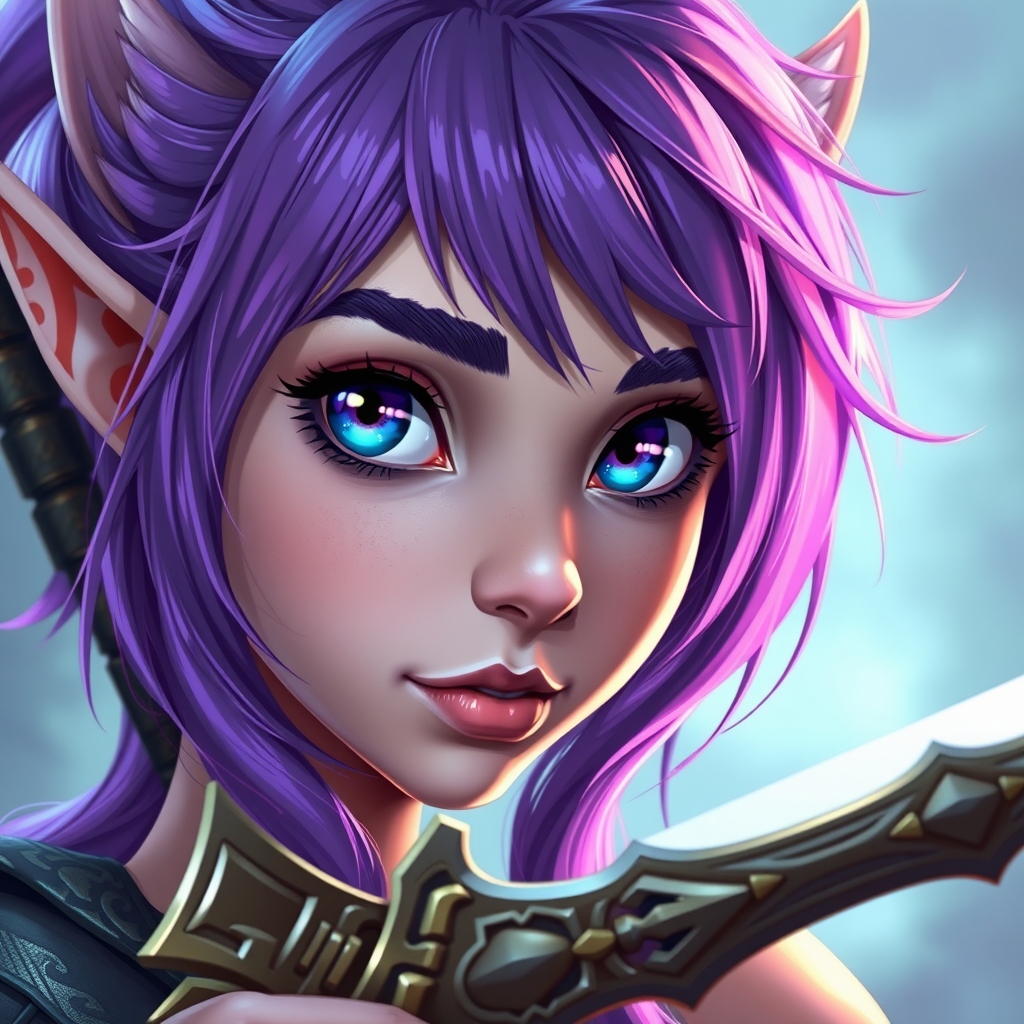 A captivating close-up portrait of an elf girl with striking purple hair, holding a intricately designed sword. The artwork captures the ethereal beauty and mystique of elven features with large, expressive eyes and delicately pointed ears. A fusion of styles inspired by Rossdraws' evolution from 1.0 to 2.5, combined with Artgerm’s vibrant and dynamic energy, Julie Bell's attention to detail, and Beeple's innovative digital artistry. This stunning character art showcases a vivid, dreamlike color palette and a perfect blend of cartoon vibrancy and realistic detailing, creating an enchanting and timeless portrayal of this fantastical being.