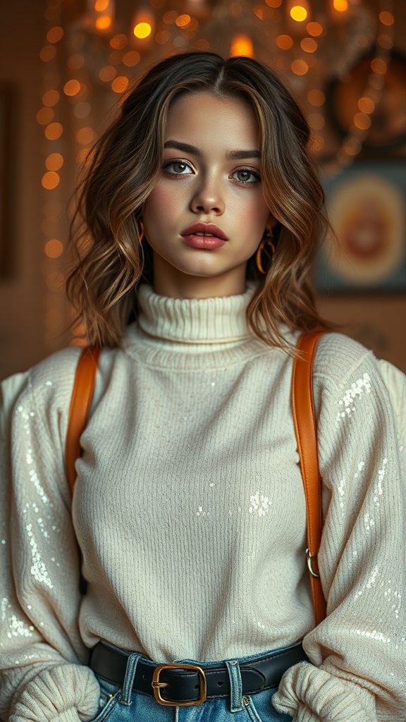 A captivating commercial photo captures a youthful Instagram model, embodying the essence of sparklecore with glittering accents and glossy textures. As an appropriation artist, she surrounds herself with unique, one-of-a-kind pieces that boast clear edge definition. The color palette exudes warmth with light brown and light amber hues. Captured through the lens of a Fujifilm X-T4 paired with a Sony FE 85mm f/1.4 GM, the image emphasizes a soft, elegant bokeh. The model, exuding confidence and allure, stands as the focal point, with the scene immersing viewers in a raw yet sophisticated style.