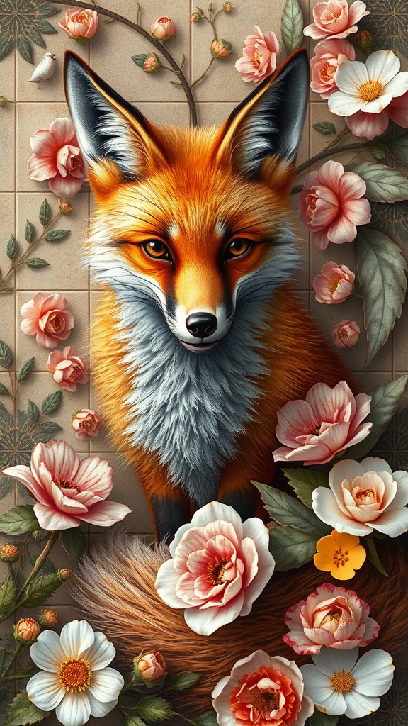 A captivating composition featuring a fox amidst ceramic tile art, adorned with breathtaking flowers. The scene is intricate and elegant, with a high level of detail characteristic of concept art. The fox and flowers are rendered in smooth and sharp focus, drawing inspiration from the styles of Artgerm, Greg Rutkowski, and Alphonse Mucha. Created in UHD, HDR, and 16K resolution, the work exudes clarity and vibrancy. The depiction avoids any duplications, disfigurement, or mutations, ensuring natural and harmonious proportions. No low-resolution artifacts or distractions such as watermarks, logos, or text are present, maintaining the purity of the artwork.