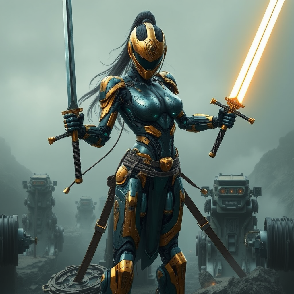 A captivating cybernetic female warrior wielding twin swords, depicted in robotic expressionism with dark gold and dark cyan hues. She stands amidst futuristic contraptions inspired by the atmospheric landscapes of Alois Arnegger, viewed from a high-angle perspective. Her movements evoke the fluid grace of Xu Beihong's art, capturing the elegance and poise reminiscent of Nusch Éluard. The scene blends organic and mechanical elements, showcasing a harmonious dance of strength and beauty in a visionary, futuristic setting.