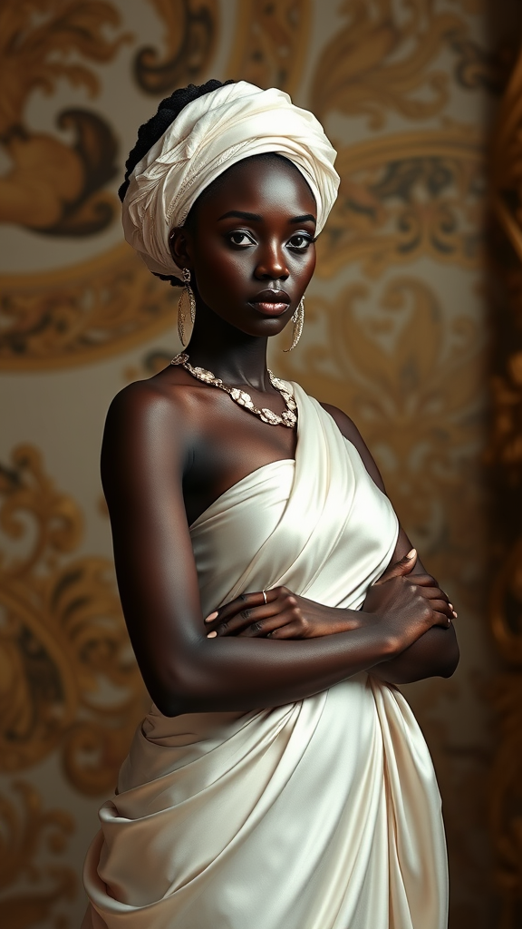 A captivating dark-skinned beauty, reminiscent of a goddess of love, stands poised in a scene inspired by Roberto Ferri. She wears an exquisite ensemble of white silk that accentuates her elegance, akin to the works of Maria Borges and Adut Akech. Her presence echoes the opulence of ebony rococo, with an enchanting charm captured in the style of Nadine Ijewere. The luminous contrast of her attire against her deep, radiant complexion celebrates her timeless allure, embodying a vivid portrait of grace and sophistication.