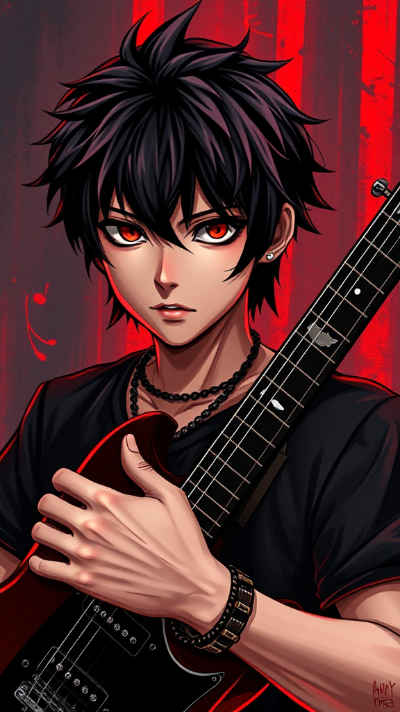 A captivating Davinci-style portrait of a stoic anime boy with dark black hair, holding a sleek electric guitar. His edgy spikes and punk-inspired wristband accentuate his cool attitude. The background resonates with a rock music vibe, infused with neon red and deep black hues. The mysterious focus on the boy’s expression highlights a rebellious charm, with subtle visual nods to the gritty allure of an underground music scene. The portrait captures an intense yet serene aura, blending the classic artistry with a modern, edgy twist.