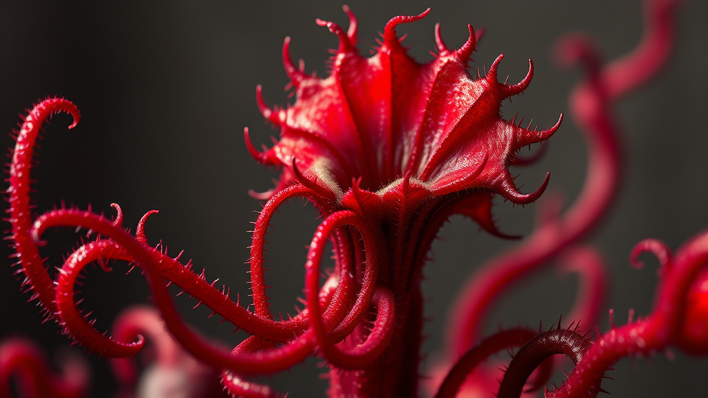 A captivating depiction of a carnivorous Drosera plant with thorny, tentacle-like appendages, rendered in a rich crimson hue, evoking the style of Rembrandt. This highly detailed artwork is designed to trend on platforms like CGSociety and ArtStation. It embodies the Midjourney Style with subtle artistic twists, presenting an intriguing blend of imperfect anatomy and abstract elements, offering a unique and mesmerizing visual experience.