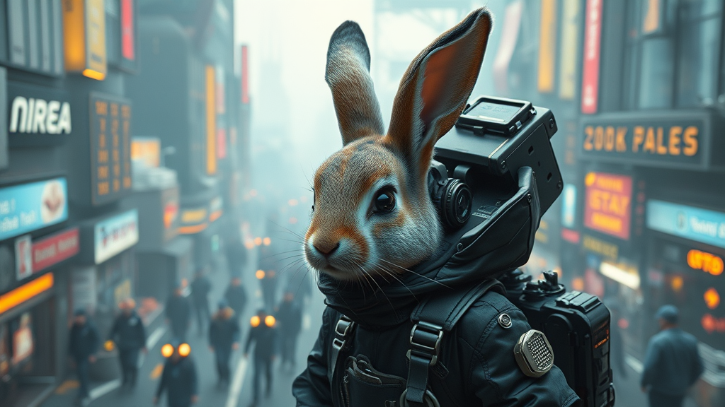 A captivating depiction of a cyberpunk-inspired dark future featuring a stunningly attractive humanoid rabbit around 25 years old. This rocket-rabbit exudes a blend of cuteness and edginess, dressed in sleek dystopian attire. The backdrop showcases a beautifully detailed grimdark landscape, bustling with futuristic elements. The scene is illuminated perfectly with studio lighting to highlight every intricate detail, creating a masterpiece that embodies the fusion of charm and the chaotic allure of a busy, technologically advanced world.