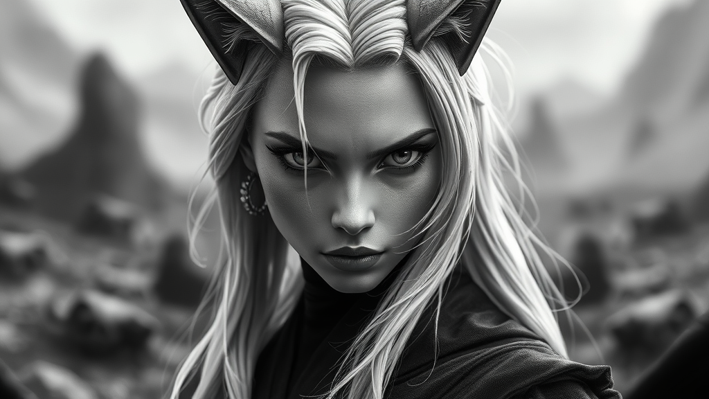 A captivating depiction of a female Sith lord from STAR WARS, with striking white hair cascading around cat-like ears, and a beautifully sculpted, hyper-detailed face. Set in a dynamic pose, her presence dominates an immersive, monochrome landscape, enhanced by a sophisticated grayscale palette. The scene features a depth of field that draws the eye to the foreground, capturing her intense aura. The composition is a true masterpiece rendered in 8k resolution, evoking a sense of otherworldly intensity. Surrounded by a backdrop that adds to her commanding demeanor, the setting subtly hints at a galaxy far, far away, while minor creative elements ensure a fresh take on Sith lore.