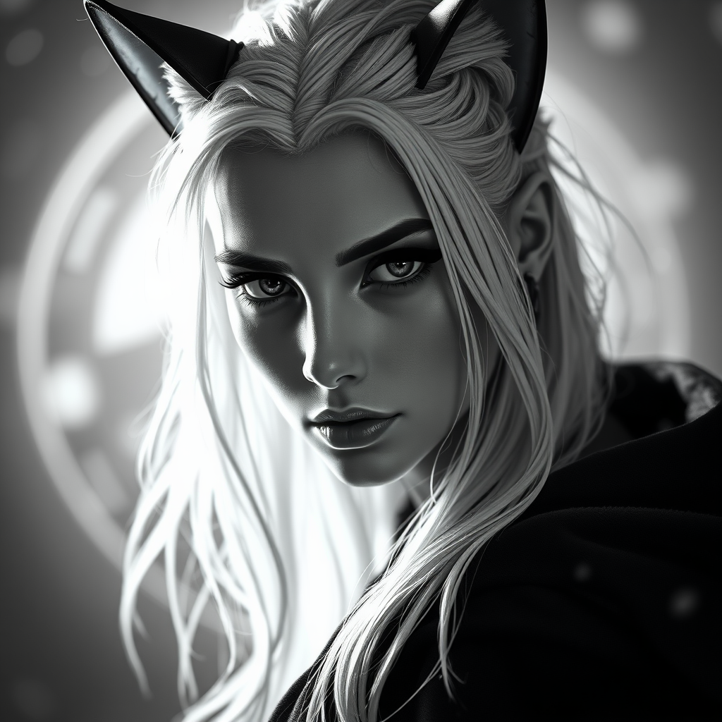 A captivating depiction of a female Sith Lord from the STAR WARS universe, characterized by striking white hair and elegant cat ears, showcasing a breathtakingly beautiful face. The portrait exhibits hyperdetailed features captured with mastery, enveloped in an 8k resolution. The dynamic pose adds energy and intensity, set against an immersive background with a stunning depth of field effect. The monochrome, grayscale palette enhances the dramatic atmosphere. Minor creative elements like swirling energy or subtle expressions of power are incorporated, alongside the expert use of negative space and refined techniques.