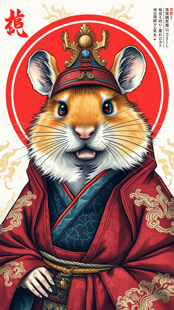 A captivating depiction of a hamster adorned in the regal attire of a feudal Japanese shogun, positioned centrally as the key visual. The artwork is intricately detailed with a focus on breathtaking beauty and precision in linework. The composition showcases vibrant colors and a cinematic feel inspired by Carne Griffiths and Conrad Roset, rendered with exceptional clarity. The portrait avoids imperfections such as disfigured anatomy, errors, or poorly rendered features, emphasizing elegance and correctness. The hamster's expression exudes wisdom and authority, framed in a harmonious and aesthetically pleasing manner.