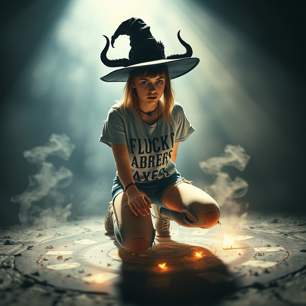 A captivating depiction of a young woman in a casual outfit featuring a punk t-shirt and torn legwear, wearing a whimsical witch hat while kneeling at the center of a summoning circle. Viewed from a low angle for dramatic effect, the scene is bathed in atmospheric lighting that creates a volumetric glow around her. She is adorned with a crown and mystical horns, adding an otherworldly touch. Her expression is focused and intense. Despite the intricate detailing, the image retains an artistic charm, with subtle imperfections and a dreamlike quality enhancing the mystical atmosphere. This enchanting scene merges elements of fantasy and punk fashion, capturing a unique and imaginative moment.