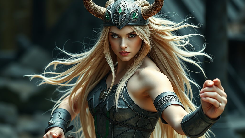 A captivating depiction of Sigyn from Norse mythology, portrayed as a Viking goddess in an armored dress. Her flowing blonde hair cascades over her bare shoulders, and she's poised in a dynamic fighting stance. The ensemble has green accents and is paired with a cinematic lighting crown and horned helmet. The focus is solely on her, capturing her strength and elegance. Despite low resolution, the image conveys the essence of her formidable spirit, with an emphasis on her warrior attire and determined gaze.