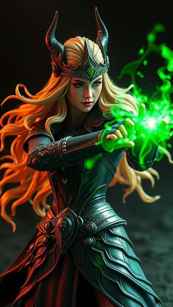 A captivating depiction of Sigyn, the Norse goddess from mythology, adorned in a Viking-inspired armored dress. Her blonde hair flows elegantly around her as she prepares to unleash powerful magic spells, striking an impressive fighting stance. Green accents highlight the intricate details of her attire, and she is the sole focus of this scene, brought to life with dramatic, cinematic lighting. She wears a crown with horns integrated into her helmet, embodying a regal yet fierce appearance. Despite the low resolution and presence of imperfections such as unintended text, watermark, or minor errors, the image maintains its charm. The figure's design cleverly avoids common pitfalls like extra limbs or fingers, blurriness, and other signs of poor quality, allowing Sigyn's strength and grace to shine through.