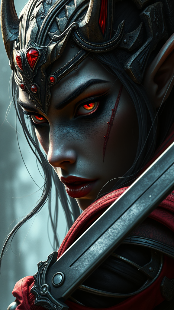 A captivating digital art image of a female elf assassin with dark skin and piercing red eyes, portrayed in an intricate and overdetailed style, reminiscent of artists Dan Mumford, Peter Mohrbacher, and Greg Rutkowski. This fantasy character is depicted in a richly detailed illustration, capturing the imagination with its high dynamic range and 4k resolution, garnering attention on platforms like Artstation for its exceptional quality. The composition maintains the essence of fantasy, with subtle creative elements that enhance the overall quality and visual impact, avoiding common pitfalls of low resolution and poor quality, ensuring a stunning presentation at its best.