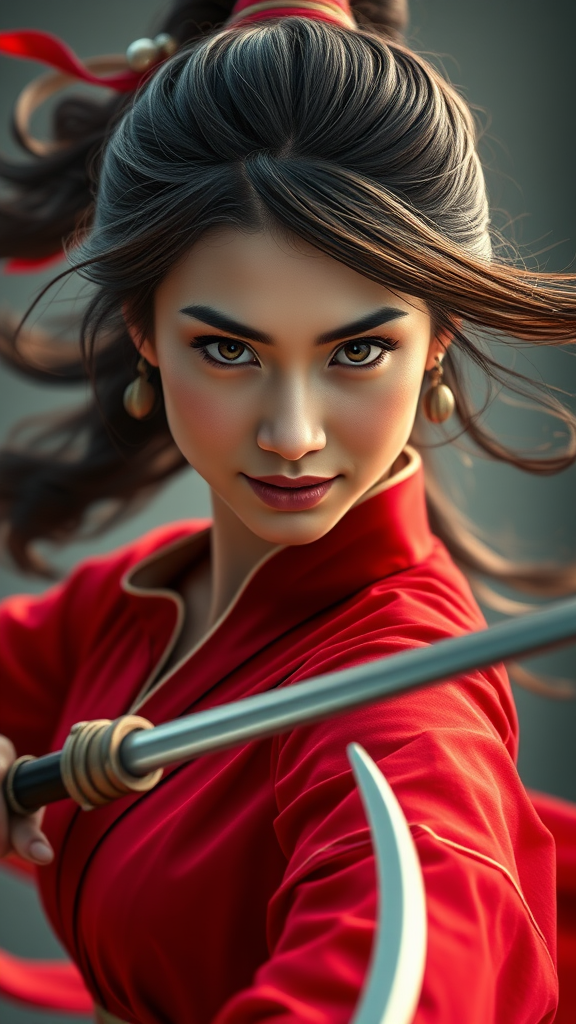 A captivating digital art portrait of a fearless warrior inspired by Disney's Mulan, featuring a fierce and determined smile. She is clad in a vivid scarlet dress, embodying strength and courage with a commanding presence. The half-body frame highlights her bold stance, dynamism captured with an intense soft focus. Her piercing eyes and flowing hair convey a sense of motion and power. The artwork, reminiscent of Martin Ansin's style, captures this modern warrior in ultra HD, with a dynamic and emotional aura enveloping her striking front view.