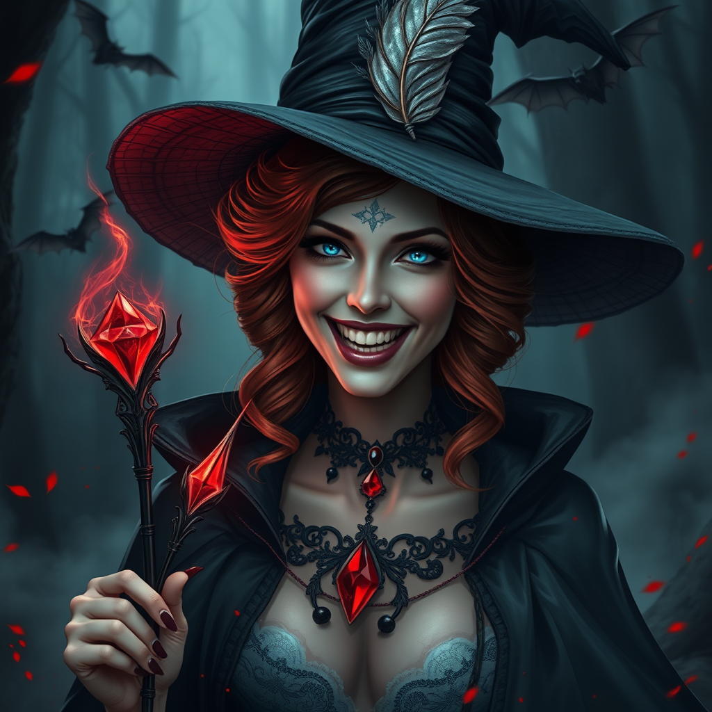 A captivating digital fantasy artwork showcases a witch with mesmerizing features. The central figure is a woman with alabaster skin and fiery red hair styled in cascading waves. She dons an elegant black witch's hat adorned with an iridescent feather, and a flowing, lace-edged cloak. Her eyes shine an electric blue, and her wide smile reveals razor-sharp, elongated fangs. In her right hand, she grips a wand that emits a swirling, crimson luminescence. An intricate black choker with a radiant red crystal pendant adorns her neck. The backdrop is an enigmatic, fog-laden forest, where shadowy bats soar, amplifying the mystical and foreboding ambiance. The scene is enveloped in deep, shadowy hues with splashes of red, intensifying the enchanting and otherworldly theme of the artwork.