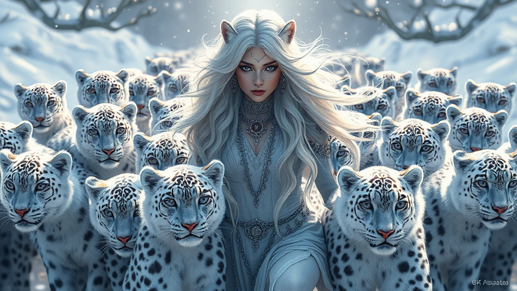 A captivating digital illustration of a snow leopard goddess woman in full body view, set in a wide-angle shot. She strikes a dynamic pose with a look of intense concentration on her face, her long white hair flowing around her. She is surrounded by a mesmerizing gathering of snow leopards, each elegantly positioned to create an interesting composition. The artwork embodies photorealism, featuring an 8k resolution with super detailed textures, showcasing the scene as a masterpiece. The wide-angle perspective enhances the grandeur of the setting, focusing on the ethereal connection between the goddess and the snow leopards.