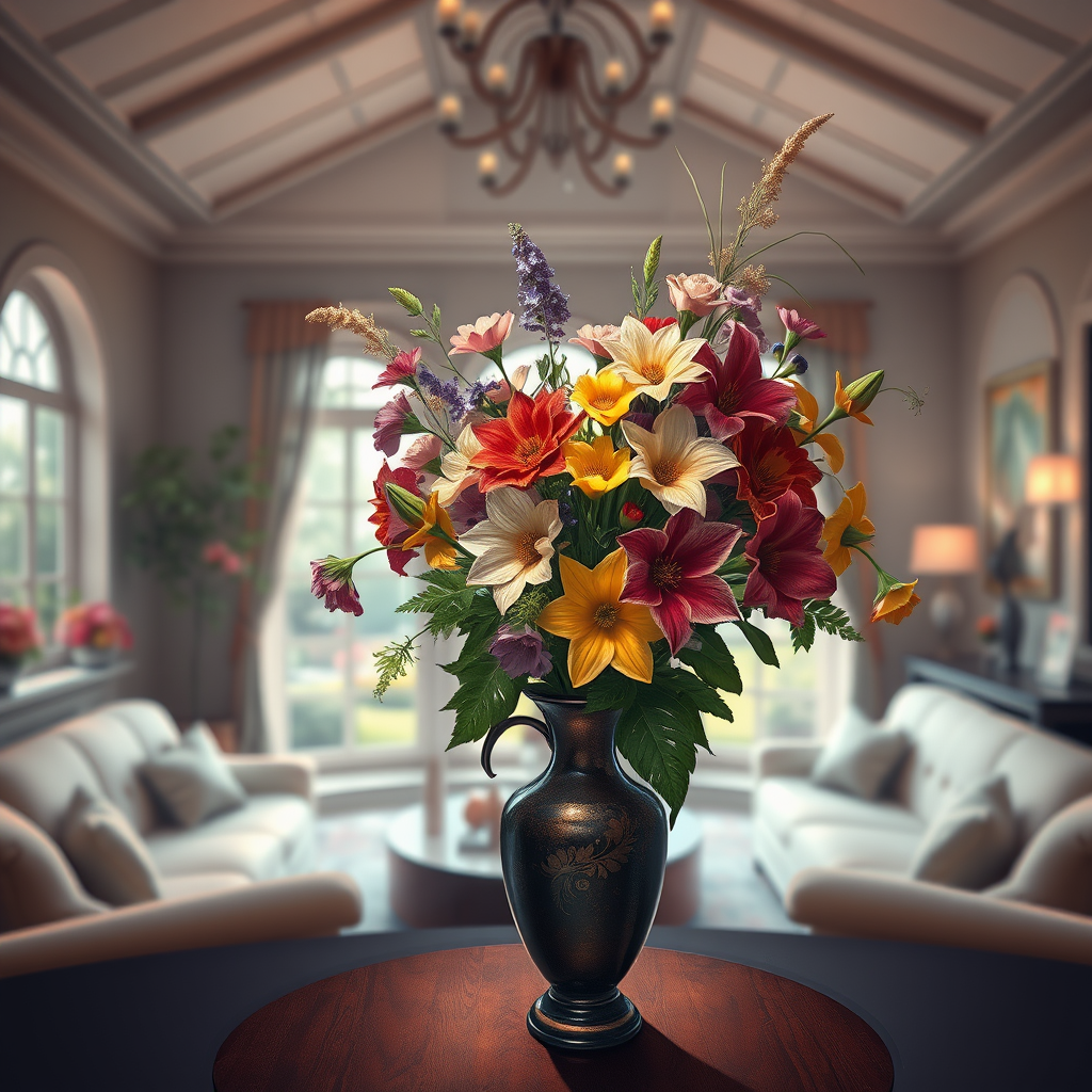 A captivating digital painting depicting a lush bouquet of vibrant flowers elegantly arranged in a vintage vase, set against a chic interior backdrop. The scene unfolds in a dreamy sunken living room featuring an inviting conversation pit, with small windows offering glimpses of a serene garden beyond. The space is adorned with a high ceiling, allowing soft, diffused light to fill the room, enhancing the intricate textures and depth of field. The artwork, rendered in stunning detail, channels the essence of a masterpiece by artgerm, greg rutkowski, and alphonse mucha. Incorporating hdr 4k and 8k resolution, the piece is a trending concept art piece on Artstation, showcasing its fine details and sweeping elegance. The design adds subtle modern touches with abstract patterns in the background, harmonizing classic elegance with contemporary flair.