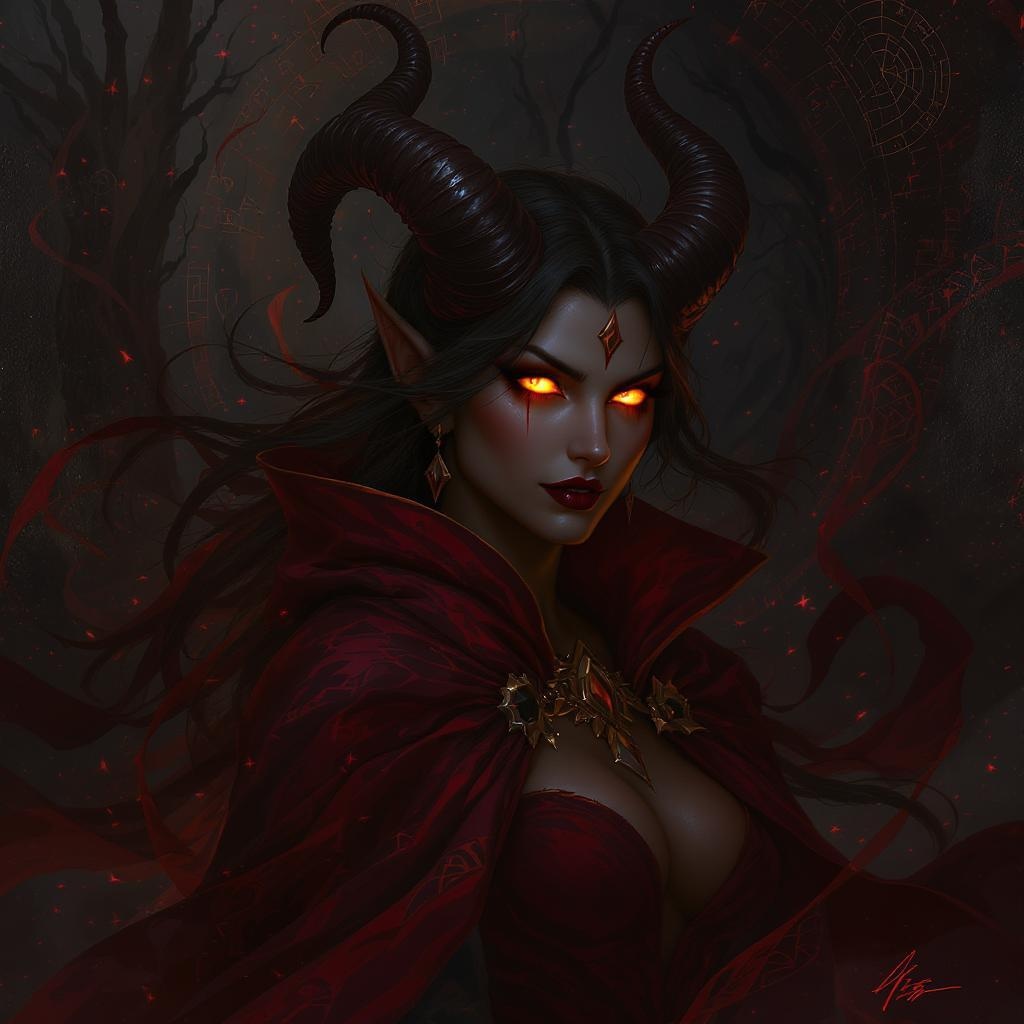 A captivating digital painting depicting a mysterious tiefling woman adorned with elegantly curved horns, her flowing red cape echoing the fiery depths of her power. This portrait of a captivating demon girl reveals her as a bold female warlock, her eyes glinting with arcane secrets. Inspired by the enchanting styles of Alena Aenami and Artgerm, her presence commands attention in a dark fantasy realm. The artwork captures a mesmerizing blend of allure and mystery, with intricate details reminiscent of Mohrbacher and the otherworldly atmosphere of Guillem H. Pongiluppi. Her features, both demonically exotic and hauntingly beautiful, are highlighted by the interplay of light and shadow, creating a stunning, immersive depiction that transports viewers to a world where fantasy and darkness intertwine.