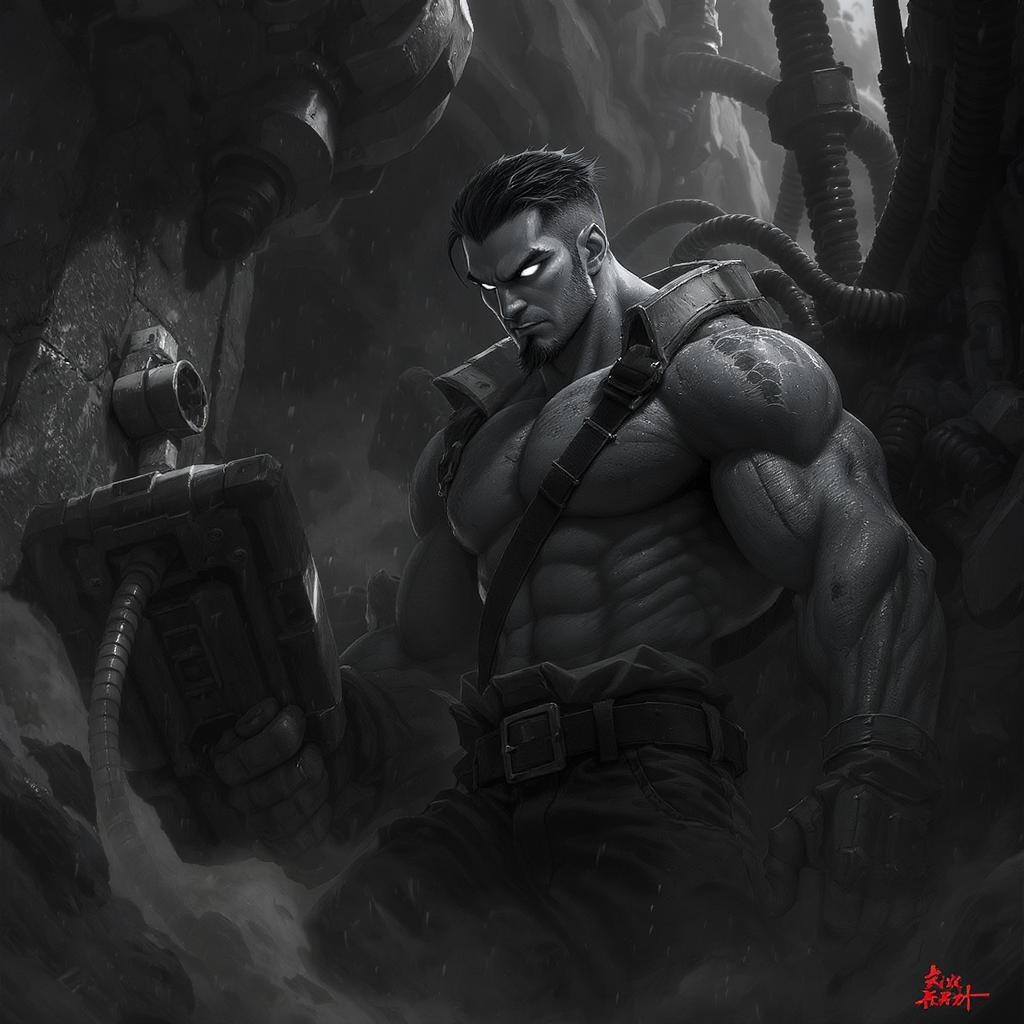 A captivating digital painting of a striking artwork centered on a man in an industrial mechanical setting, amidst a fantastical location. The scene captures a full-body action shot of a rugged worker in a harsh environment, rendered in astonishing 8k quality. His skin pores and intricately detailed iris highlight the precision of the piece, set against very dark lighting and heavy shadows for dramatic effect. The man's detailed face is reminiscent of art by Artgerm, WLOP, and Ilya Kuvshinov, blending elements of both Asian and cartoon styles. The image features a sharp focus on a detailed, animated expression, with the subject wearing denim. The black and white palette adds depth to the already rich illustration, reminiscent of a 3D render yet maintaining a smooth, narrative quality. The piece exudes high quality, free of any sketchy, low-res elements or distracting artifacts, embodying a perfect fusion of realism and artistic imagination.