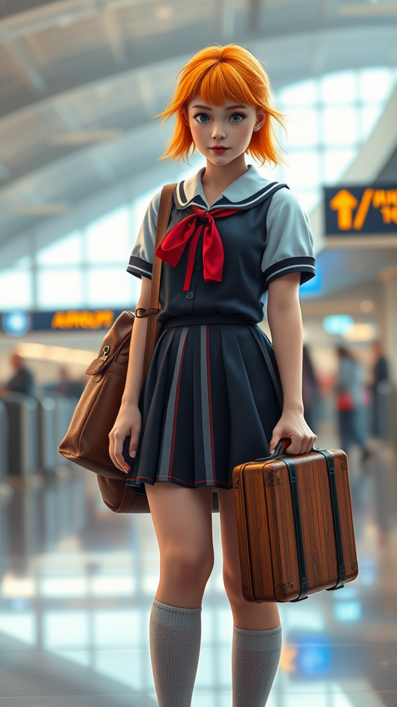 A captivating digital portrait of a young woman with vibrant orange hair, dressed in a magical school student uniform complete with a skirt and high socks, standing confidently in an airport interior. She holds a vintage suitcase, her expression both focused and whimsical, evoking a sense of adventure and mystery. The artwork is inspired by the storytelling quilt art of Harriet Powers, blending tradition with contemporary flair. It's a trending piece on CG Society, reminiscent of a hyperrealistic still from a live-action movie, capturing the enchanting essence of a schoolgirl transitioning into a world beyond the classroom, with a hint of fantasy in her gaze.