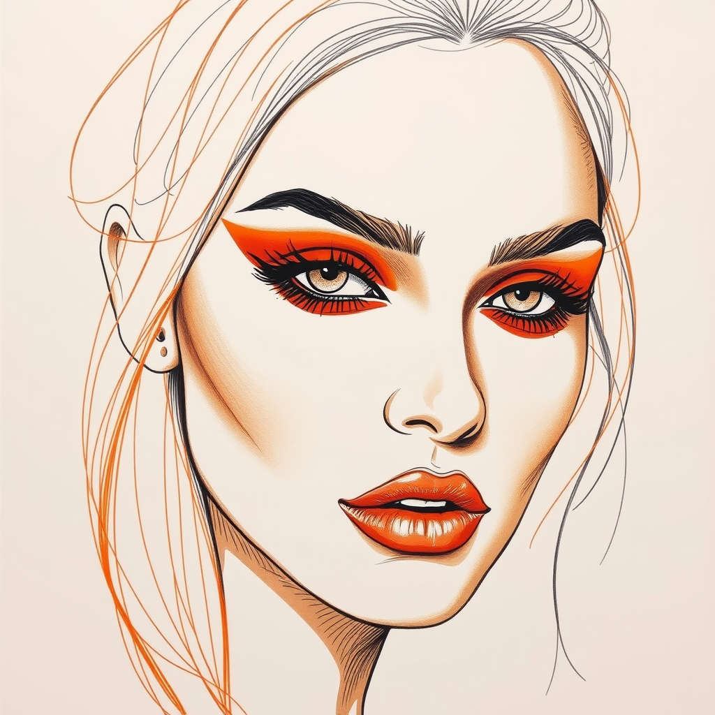A captivating drawing of a woman's face, her striking red eyeshadow accentuating her features, rendered in bold and colorful lines. The portrait combines dark beige and orange hues, with flawless line work akin to intricate wire sculptures. The composition is raw and edgy, capturing a sense of fierce elegance and modern artistry, with subtle additions of contrasting hues to enhance depth and allure.