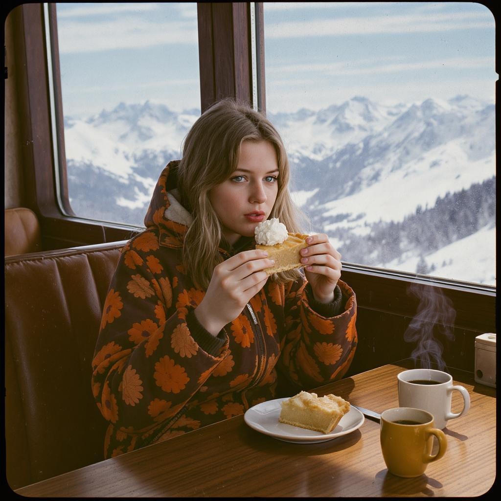 A captivating Dutch girl in a retro 70's mountaintop diner, surrounded by panoramic snowy landscapes. She enjoys a freshly baked slice of pie with a dollop of whipped cream, alongside a steaming cup of coffee. Taking a break from the slopes, she dons a vintage brown and orange floral-patterned ski jacket that perfectly captures the era's spirit. This moment, full of warmth amid the chill, is immortalized through the lens of a Canon camera using Kodak film, shot from a distance with a telephoto lens, encapsulating a nostalgic yet timeless scene.