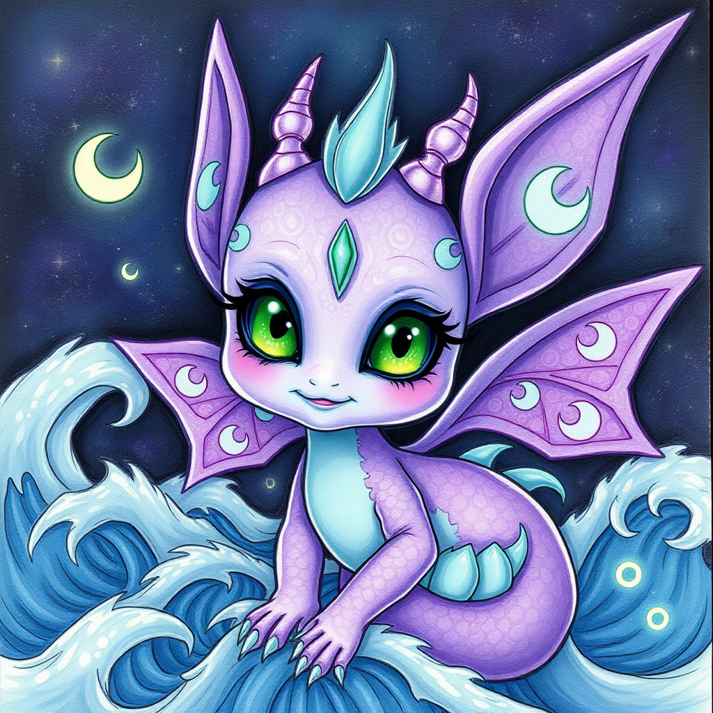 A captivating fae with emerald eyes and shimmering lavender scales adorned with enchanting crescent moon patterns, set against a backdrop of mystical, swirling waves. The creature exudes a magical aura and is illustrated in the whimsical style of Darwyn Cooke, capturing a sense of mystery and allure. The exquisite sketch emphasizes its ethereal presence, combining whimsy and elegance in a balanced composition.