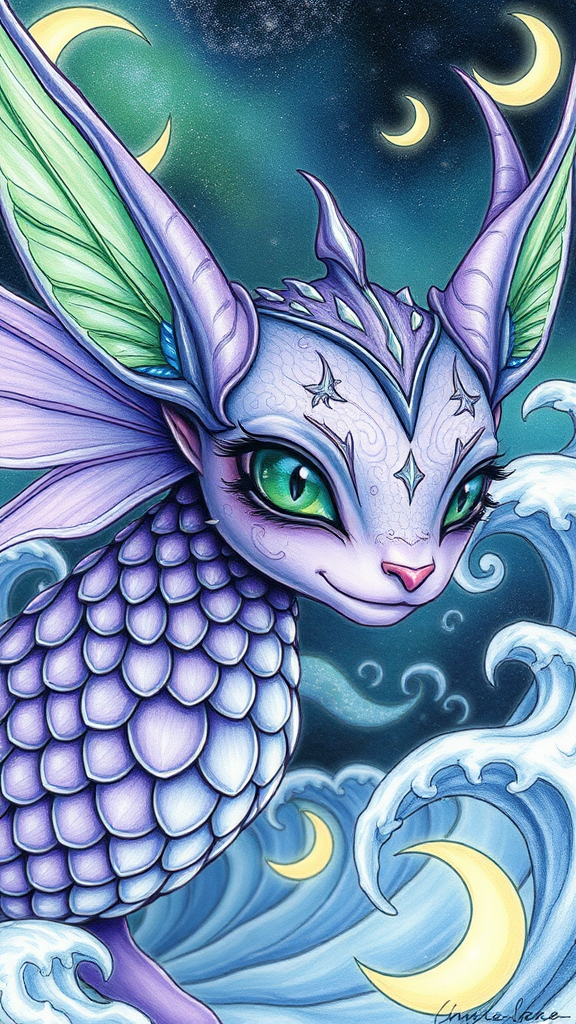 A captivating fae with striking emerald eyes and shimmering lavender scales, intricately patterned with enchanting crescent moons, set against a backdrop of mystical, swirling waves. This mesmerizing creature radiates a magical aura, captured in an exquisite sketch drawing in the style of Darwyn Cooke illustrations, with a whimsical theme. Rendered at 800x800 resolution, the illustration invites the viewer into a world of fantasy and mystery, its delicate details and enchanting composition evoking a sense of wonder.
