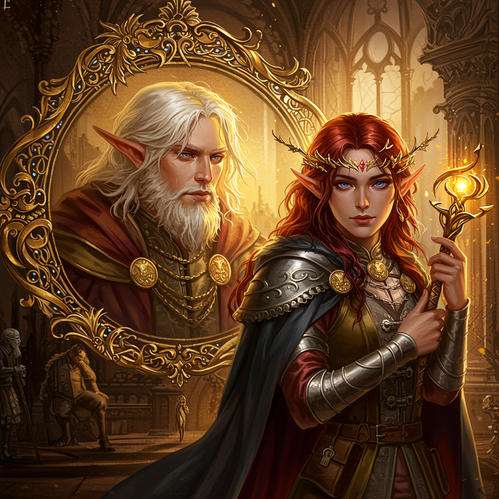 A captivating fantasy painting displayed in an art gallery, featuring intricately detailed character illustrations. The scene is bathed in a luminous palette of silver and amber, with characters brought to life in hyperrealistic style. They exude charm, surrounded by hues of light gold and deep red, showcasing expressive detail in their faces. The artwork conveys rich textures reminiscent of zbrush craftsmanship, capturing the essence of magic and adventure.