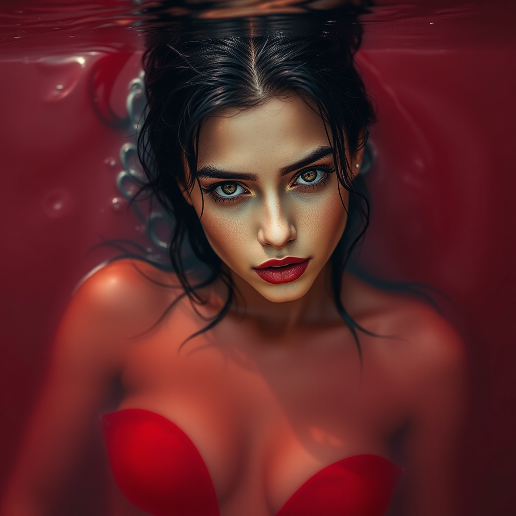 A captivating fashion editorial portrait features a striking young dark-haired woman submerged in crimson water, her wet hair and glistening skin adding to the allure. She holds a mysterious, enchanting gaze that draws the viewer in. Captured with high-resolution precision, this professional photograph utilizes a cinematic angle and dramatic backlighting to create a dynamic, ethereal atmosphere.