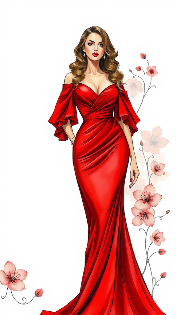 A captivating fashion illustration showcases a striking woman in a vivid scarlet dress, an award-winning piece that stands out with its electrifying hue. Her presence is both graceful and commanding, exuding elegance and confidence. Her long, flowing curls delicately frame her face, enhanced by lipstick in a matching crimson shade. The full-body perspective of the illustration highlights the dress's exquisite details and her assured stance, subtly incorporating abstract floral designs to add a touch of whimsy while preserving the boldness of the ensemble.