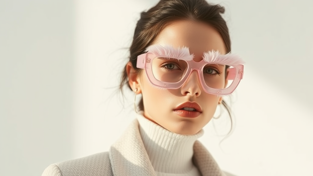 A captivating fashion shoot featuring the avant-garde collaboration between Jacquemus and Moncler: delicate light pink translucent fur sunglasses steal the spotlight, rendered in hyper-realistic, intricately detailed 8k resolution. The scene plays with soft, ethereal lighting, creating a dreamlike atmosphere that enhances the unconventional elegance of the eyewear. The model poses confidently against a minimalist backdrop, their attire a harmonious blend of both brands' aesthetics, with elements of unexpected texture and refined chic.