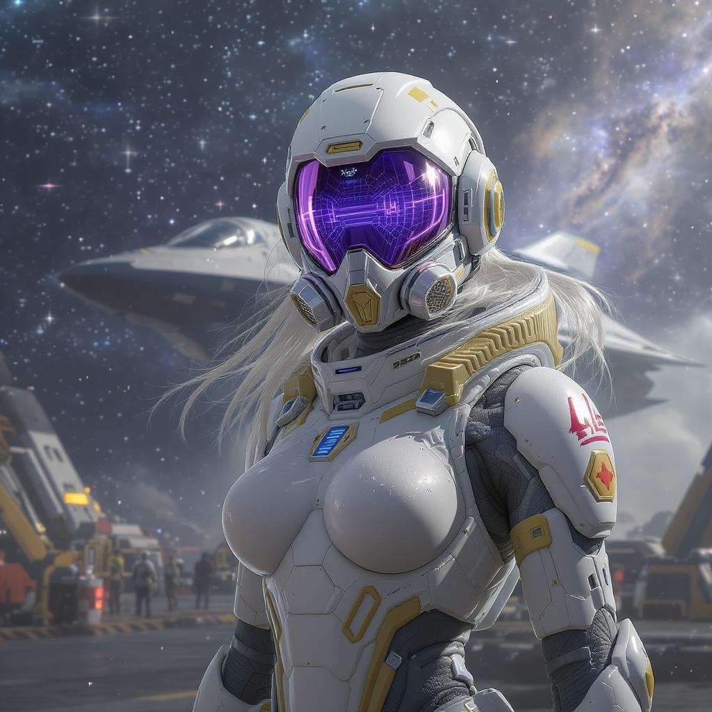 A captivating female character in an intricately detailed white and yellow jumpsuit, standing confidently in a bustling spaceport. Behind her, a sleek ship ascends into the cosmos. Her face is partially concealed by a futuristic mask adorned with a striking purple sci-fi visor and advanced lens, complemented by a high-tech respirator. The scene is rendered in exquisite detail reminiscent of a trending ArtStation masterpiece, capturing a cinematic essence with a photography level of detail. The environment is stunningly surreal and divine, filled with celestial tones and vibrant colors. The atmosphere is rich with intricacy and depth, characterized by cinematic lighting and hyperrealism. Borrowing elements from anime and manga aesthetics, the scene is developed with Unreal Engine 5’s cutting-edge Lumen reflections, presented in a flawless 3D render with the polish of an Octane engine. Despite this plethora of detail, the image struggles with constraints of low resolution, bearing some jpeg artifacts and minor text errors, yet radiating a captivating, hypnotic quality amidst the imperfections.