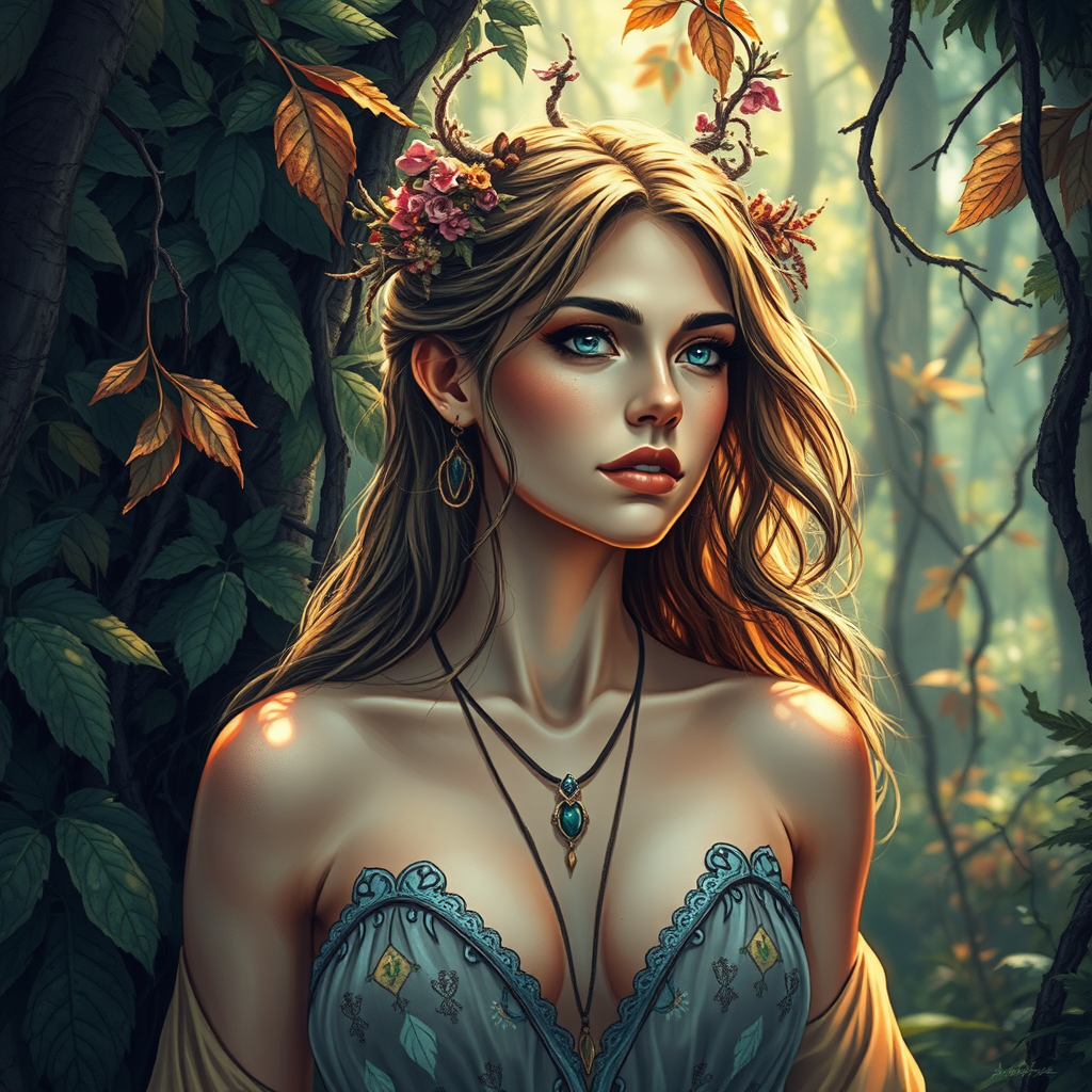 A captivating female druid stands gracefully amidst the lush depths of a forest, her presence exuding breathtaking beauty. The scene is centered around her, showcasing an intricate and highly detailed portrayal with vibrant hues. Her delicate features and the natural surroundings are depicted with precise lineart, reminiscent of Carne Griffiths and Conrad Roset's styles. She wears a simple yet elegant necklace that complements her ethereal appearance. The comprehensive cinematic quality immerses the viewer in the enchanting atmosphere, highlighting the harmony between the druid and the forest. No text, watermark, artist name, or copyright information is visible, allowing the focus to remain on the artistry and serene elegance of the composition.