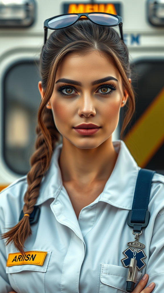 A captivating female paramedic stands confidently in front of an ambulance, exhibiting a charming and attractive demeanor as she engages with the viewer. This portrait-style photograph showcases her detailed and realistic skin, capturing her beauty in exquisite detail with an 8k resolution. The image features a full-length frame with high-detail RAW color art, highlighting her piercing eyes. The scene is set with diffused soft lighting, creating a shallow depth of field and sharp focus that bring out the hyperrealism and cinematic quality. The photo remains clear and vibrant, avoiding low resolution or any artifacts, ensuring her striking presence is the focus. Her pose is natural, and she appears perfectly proportioned with a graceful poise. There are no elements of distortion or distraction, maintaining an artistic and flawless representation.