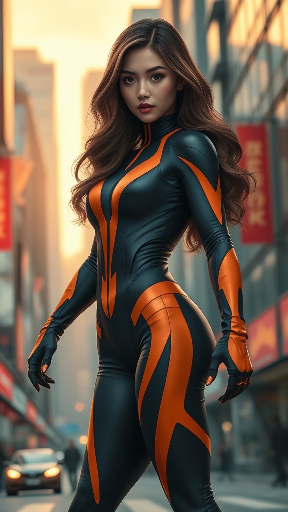 A captivating female superhero stands poised in the heart of a bustling metropolis. Her long, wavy hair cascades gracefully over her shoulders, contrasting strikingly with her sleek black and orange suit that fits like a second skin. She exudes confidence and power as she poses dynamically, every muscle conveying strength and agility. The lighting is cinematic, casting soft, volumetric beams that accentuate her form and create gentle shadows at dusk, adding an ethereal glow to the scene. The cityscape behind her is softly blurred, emphasizing her presence in sharp 8k resolution with impeccable quality. The stylistic influences of Studio Trigger, Makoto Shinkai, and Studio Ghibli are evident in the vibrant anime style and cinematic flair. The scene is vivid, clean, and free of imperfections, showcasing stunning artistry that's uninterrupted by unnecessary elements. The atmosphere is one of anticipation and wonder, capturing the essence of heroism in a beautifully crafted urban environment.