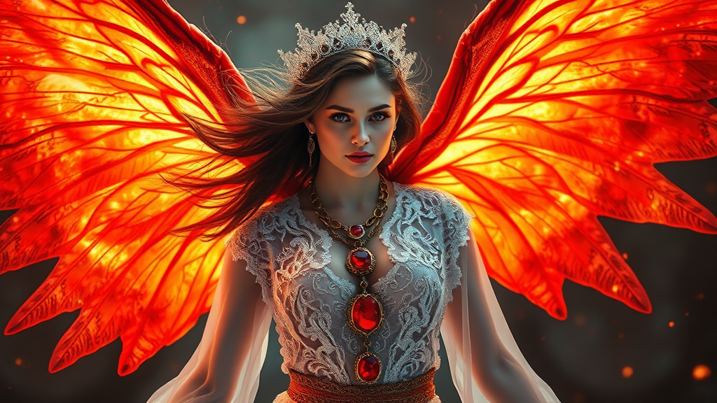 A captivating fire mage with vibrant, fiery wings suspended in mid-air, her ethereal white lace robe adorned with elegant red accents. Her delicate features are enhanced by the shimmering, intricate jewelry made of gold and embedded with radiant rubies. Volumetric lighting casts a cinematic glow, highlighting the ornate details of her attire. The design is an exquisite blend of elegance and power, with each gemstone artistically placed to enhance her aura. Her figure is bathed in warm, flickering light, creating an atmosphere that is both magical and commanding.