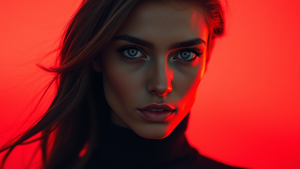 A captivating front shot captures the professional model with striking Greek dark features, showcasing heterochromatic eyes—one blue, one brown. Photographed using a Hasselblad X2D 100C with an XCD 90mm f/2.5 lens, the image plays with cinematic red color grading infused with the warmth of the golden hour. Against a dramatic burnt umber to ruby red gradient backdrop, the composition is avant-garde with the model's head tilted, delivering a profound gaze directly into the camera. The elongated stance is complemented by a flowing black turtleneck. Skillful lighting includes a main Fresnel light at a 60-degree angle softened by silk diffusion, and a rim light with CTO gel set at 75 degrees. A subtle haze enhances the ethereal atmosphere, with feathered shadows achieved through contrast curve manipulation and selective dodge and burn techniques. A grain texture overlay, along with a color temperature gradient from 5500K to 3200K, enriches the ultra-sharp details of the hyper-realistic image. The work draws inspiration from Paolo Roversi’s lighting techniques, encapsulating 16K resolution with rich detail.