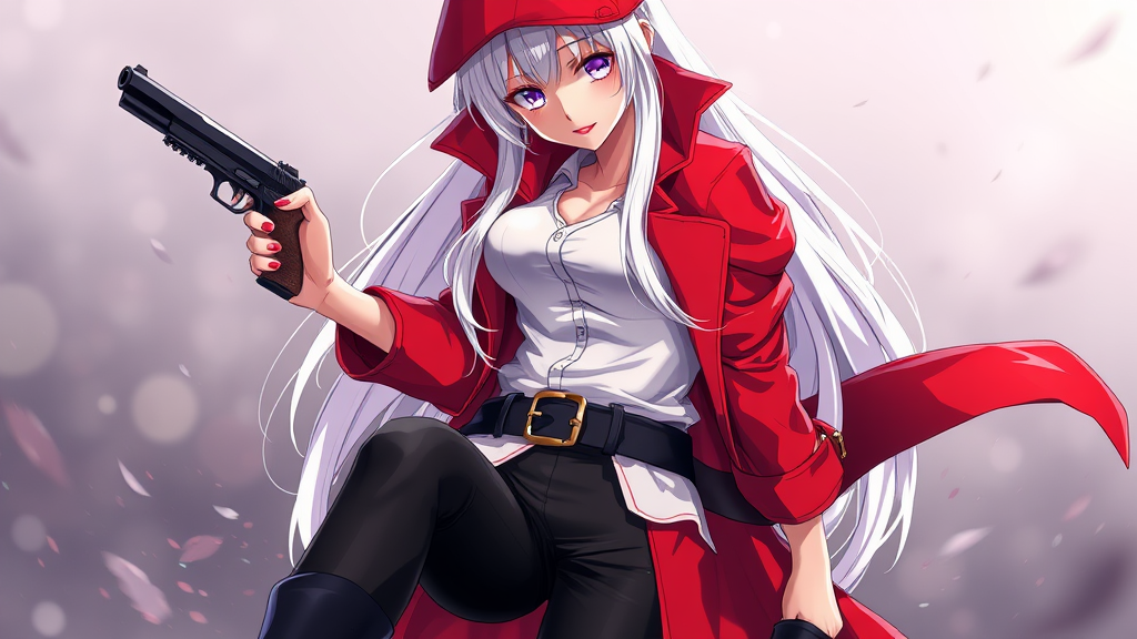 A captivating full-body digital anime art of a female character in a fantasy setting. She boasts long white hair and striking clear purple eyes, with a flawless face. Her outfit includes a vibrant red trench coat worn over a crisp white shirt, paired with sleek black pants, sturdy black boots, and a chic black belt. In her right hand, she wields a pistol, exuding confidence and allure. Her expression is seductive, accentuated by perfect eyes and red lips. Small creative touches add to her charm, such as the subtle details on her coat and a glint of mystery in her gaze. The high-resolution image ensures every detail is vivid and engaging, bringing the character to life with elegance and style.