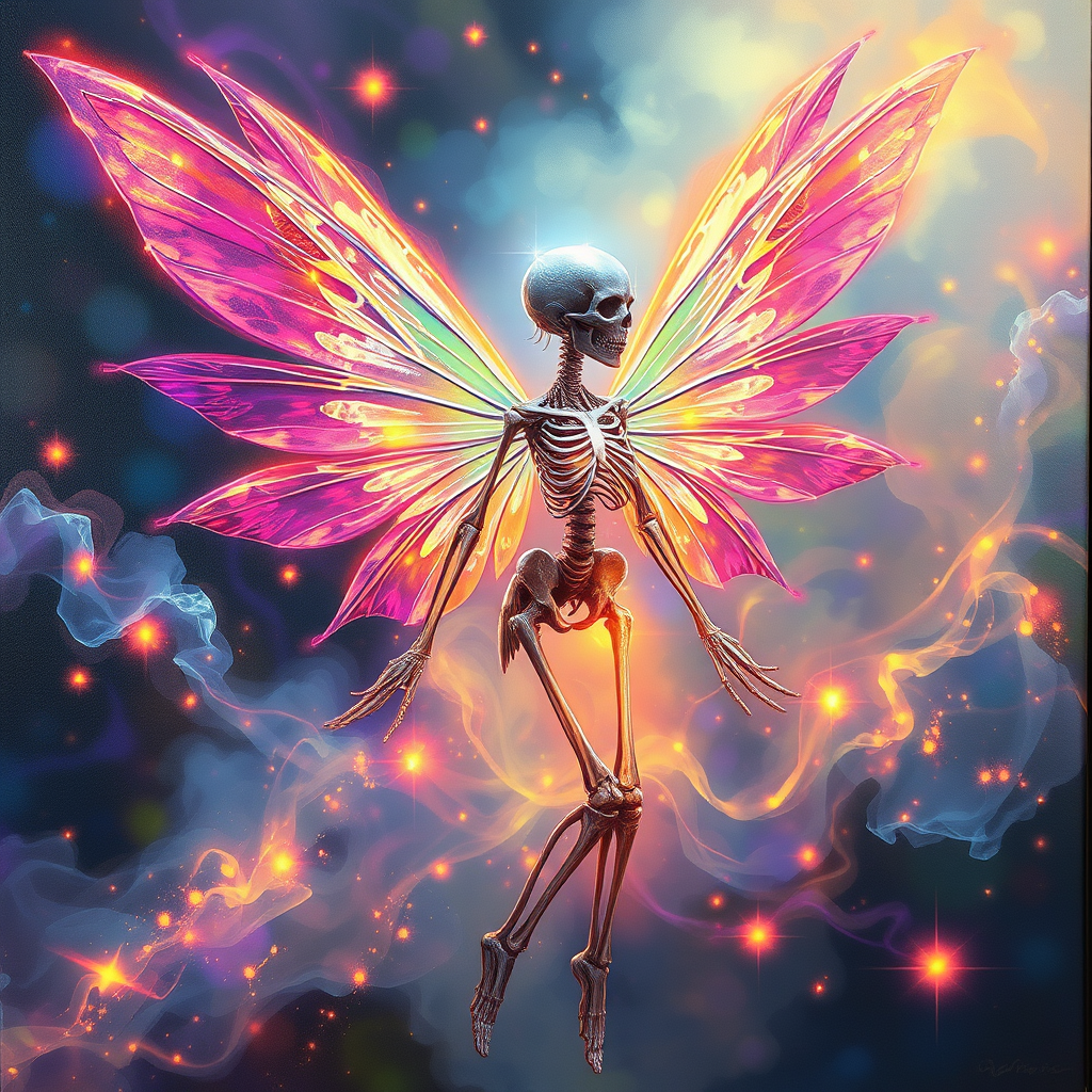 A captivating full body illustration of a fairy with intricate skeletal anatomy, showcasing the wing skeleton and detailed anatomical features. Enveloped in an enchanting fairytale atmosphere, the scene glows with magical, multicolored swirling smoke and luminous particles. The fairy radiates with soft neon light, rendered in sharp focus with extraordinary detail. Crafted as a contest-winning concept art, the piece demonstrates mastery and professionalism, ideal for platforms like ArtStation, Imgur, and Pinterest. Presented in high-definition, the oil on canvas painting boasts colorful vibrancy and a dynamic perspective, offered in HD, 4K, and 8K resolutions.