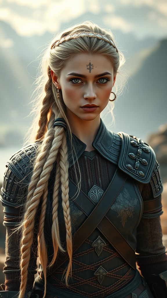 A captivating full-body image shot on a vintage 1950's camera, capturing the essence of a 25-year-old war princess with flaxen blonde hair accented by cultural face paint. She stands adorned in intricate cloth armor amidst an elegant urban fantasy setting, backdropped by a stunning fog-kissed mountain view. Her long, braided hair cascades gracefully, complementing her bright grey eyes that convey a mesmerizing allure. The scene radiates with cinematic sophistication reminiscent of a 1980s movie still shot on Kodak Portra 800 film, featuring exquisite, ultra-realistic detail. Her symmetrical face and detailed facial features are highlighted by radiant beams of light, creating a magical and ethereal atmosphere. The image captures a sense of light excitement and heavenly serenity, enhanced by shadowy and misty surroundings. The digital rendering utilizes octane render and unreal engine 5 technology, bringing forth maximum realism with finely detailed skin texture, ambient occlusion, and tone mapping. Despite its striking detail, the scene maintains a lifelike authenticity with natural shadows and realistic proportions. Her enchanting gaze and elegant demeanor are emphasized by backlighting and light rays that infuse the image with a sense of enlightenment and moodiness. The artistic digital painting presents a highly detailed artistic concept, suitable for a magazine cover or as striking concept art, leaving no room for flaws as it embodies an exquisite portrayal of fantasy realism.