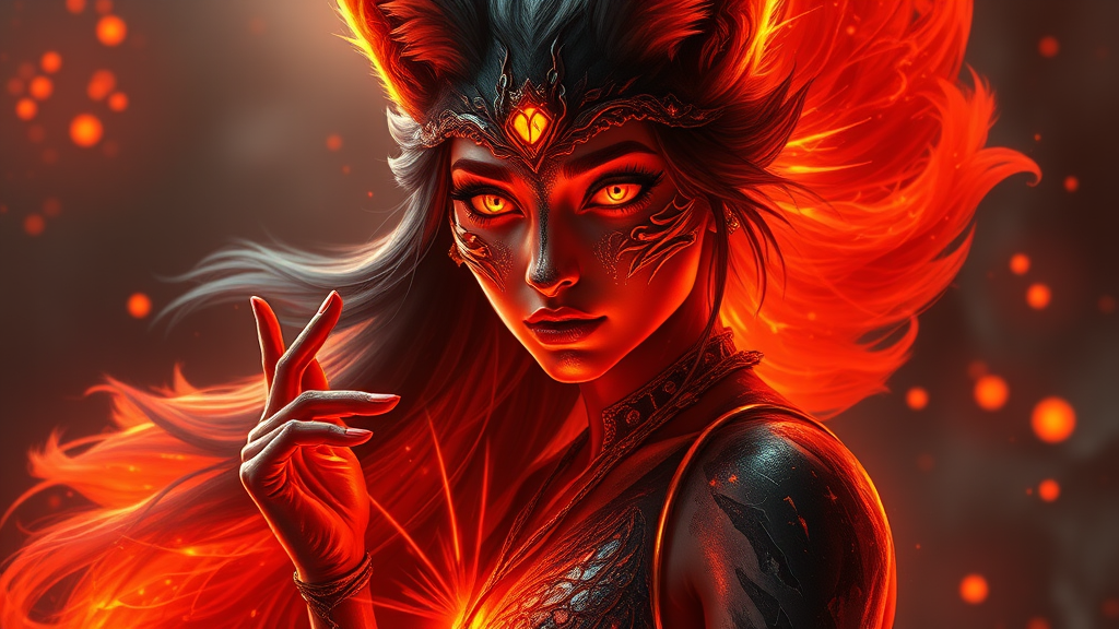 A captivating full body portrait of a fox lady composed of magma and lava, radiantly glowing. Inspired by Charlie Bowater, featuring a volumetric atmosphere, exceptional quality, and sharp focus. Her face is exquisitely beautiful, with graceful hands. The artwork is high resolution, vibrant, intricately detailed, and breathtaking with precise linework. The composition is cinematic and comprehensive, boasting maximum detail in 4k UHD digital art. An award-winning piece, trending on ArtStation, showcasing a dynamic pose. No low resolution, text, or errors. The anatomy is perfect with no extra or missing elements. No watermarks, signatures, weapons, or sunglasses present.