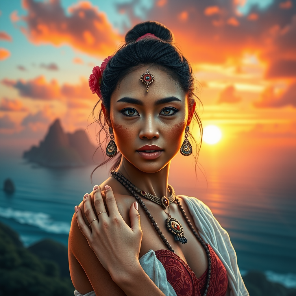 A captivating full body portrait of a Maori woman with an island background at sunset, inspired by Charlie Bowater's style, featuring a volumetric atmosphere, high quality, and sharp focus. She has a beautiful face and elegant hands, with vibrant and intricate detail in a 4k UHD resolution. This digital artwork is insanely detailed, boasting breathtaking and precise line art for a comprehensive cinematic feel. The dynamic pose and max detail give an award-winning quality, trending on ArtStation. The scene is free from any errors such as text, missing or extra fingers, poor anatomy, disfigurements, and watermarks, ensuring a flawless representation.