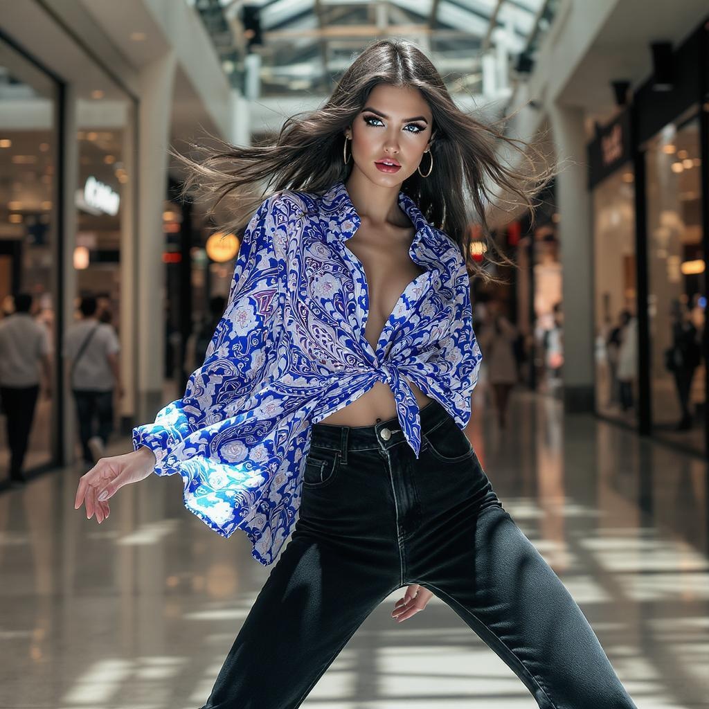 A captivating full body portrait of a stunning model with striking blue eyes, gracefully dancing in a vibrant blue batik casual shirt paired with sleek black jeans. This fashion-forward editorial shot captures the model's elegance and energy, set against the bustling ambiance of a modern mall interior. The image is a highly detailed masterpiece with an emphasis on high contrast, showcasing the dynamic interplay of light and shadow.