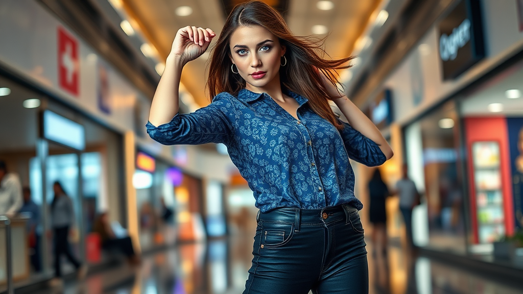 A captivating full body portrait of an elegant model with striking blue eyes, gracefully dancing in a stylish blue batik shirt paired with sleek black jeans; this fashion editorial shot captures intricate details and boasts high contrast against the vivid backdrop of a bustling indoor mall ambiance, subtly enhancing the scene with creative lighting that accentuates the model's dynamic pose and expressive movement.