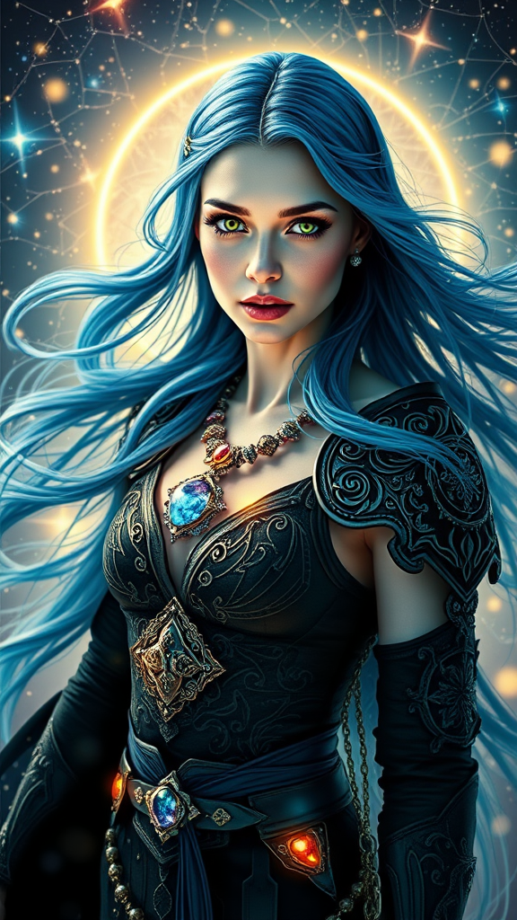A captivating full body portrait of an enchanting woman in motion, her white skin glowing under the cosmic light. She wears a dazzling gemstone necklace holding the universe within it, surrounded by an ethereal web of stars. Her long, flowing blue hair cascades around her, framed by hypnotic green eyes that captivate any onlooker. She exudes the irresistible allure of a femme fatale. Dressed in a jet-black, intricately ornate battle armor, her presence is both formidable and alluring. The scene features a double exposure effect, revealing a vibrant, artistic background where cosmic webs form the shape of a diamond. The image is cinematic and ethereal, showcasing extraordinary craftsmanship and design. It presents a full body view in an ultra-wide shot that captures the atmospheric essence with a hypermaximalist approach. The composition is rich in vibrant colors and radiant light, illuminated by a glowing halo. The illustration is ultra-realistic and intensely detailed, a masterpiece that elevates the viewer's imagination.