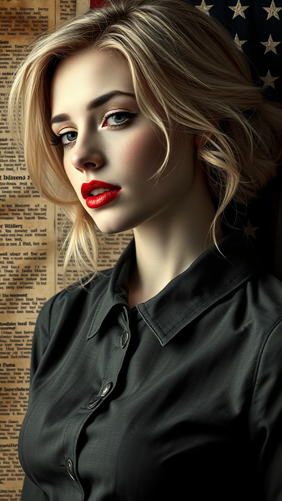 A captivating fusion of fresco and pop art with realism elements reveals a striking blond woman in a collared Oxford dress, accentuated with bold red lipstick. She is artistically overlaid on an aged newspaper and an American flag. The composition is infused with pops of blue, white, and red. The style exudes black-and-white intimacy, influenced by the aesthetics of Mike Deodato and Jan Frans van Bloemen, showcasing a slender figure with gentle lyricism. The scene is lush and rich with details, drawing on tenebrism-inspired emotional distortion in a manner akin to Anton Fadeev and Lauren Faust. The close-up is reminiscent of Léon Bakst's works, encapsulating an alluring blend of tradition and modernity, conveying a deep emotional narrative in a 1:2 aspect ratio with a high stylization level of 625.