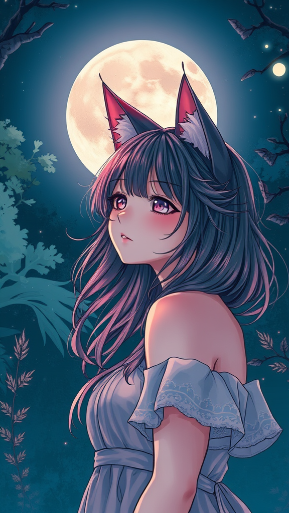 A captivating girl with cat ears under the moonlit sky, NIJIFTB theme | perfectly centered | key visual | intricate and highly detailed | breathtakingly beautiful | precise lineart | vibrant hues | cinematic depth inspired by Carne Griffiths and Conrad Roset | 8k high resolution for best quality | visually stunning | low resolution textural effects | slight imperfections like missing or extra digits, cropped elements | noticeable jpeg artifacts | subtle signature marks | slight deviations in anatomy like extra limbs | hands and feet drawn with unique characteristics | elements creatively out of frame | intriguing tiling patterns | abstract imperfections giving a distinct charm | blurred edges adding to the mystique | artistic watermarks and subtle text.