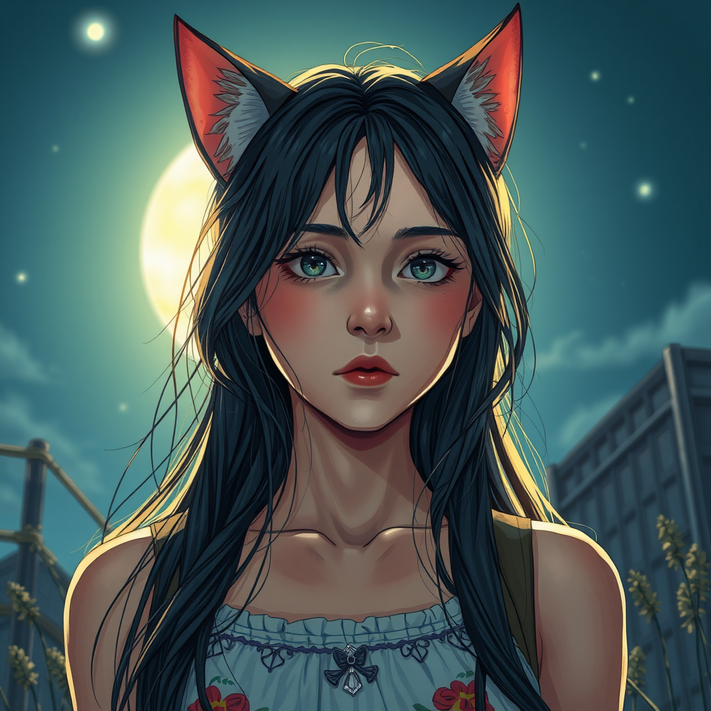 A captivating girl with delicate cat ears under the moonlight, showcasing central focus in a key visual with intricate and highly detailed artwork. Her breathtaking beauty is highlighted by precise linework and vibrant colors, creating a comprehensive cinematic feel reminiscent of Carne Griffiths and Conrad Roset. The scene is rendered in stunning 8k high resolution, achieving the best quality possible while avoiding common art pitfalls like missing or extra digits, misproportioned anatomy, or distractions such as watermarks and text overlays.
