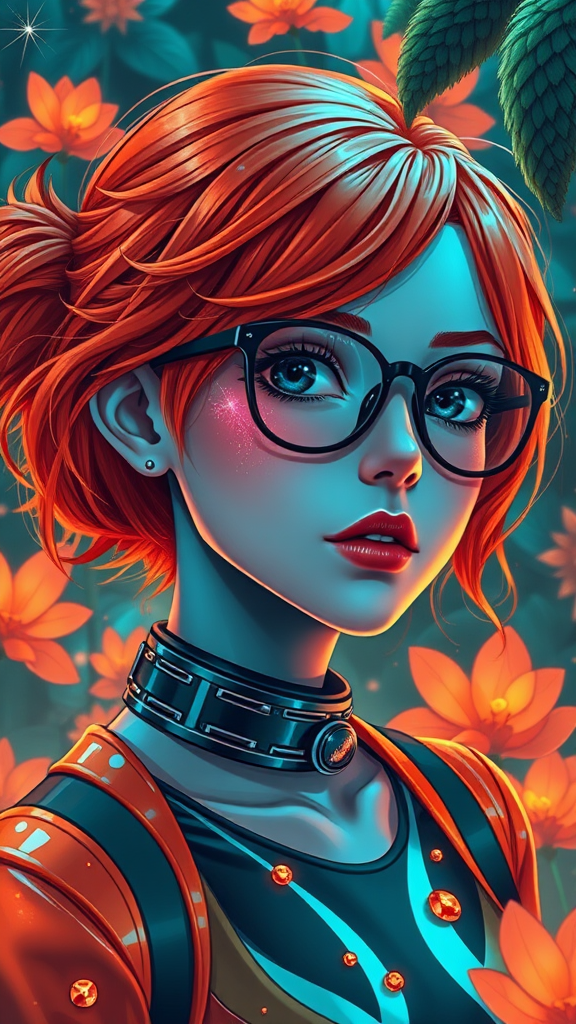 A captivating girl with vibrant orange hair, adorned with chic glasses, presented in a futuristic digital art style. Her aesthetic merges the essence of flowerpunk with an eye-catching blend of dark teal and orange hues. The scene is imbued with a lively color palette, highlighting her dynamic and charming personality. Her attire shimmers with a glossy finish, reflecting the interplay of light in a world that bridges nature and technology. The environment around her complements her presence, filled with lush, surreal botanical elements that pulsate with energy, creating an enchanting visual experience.